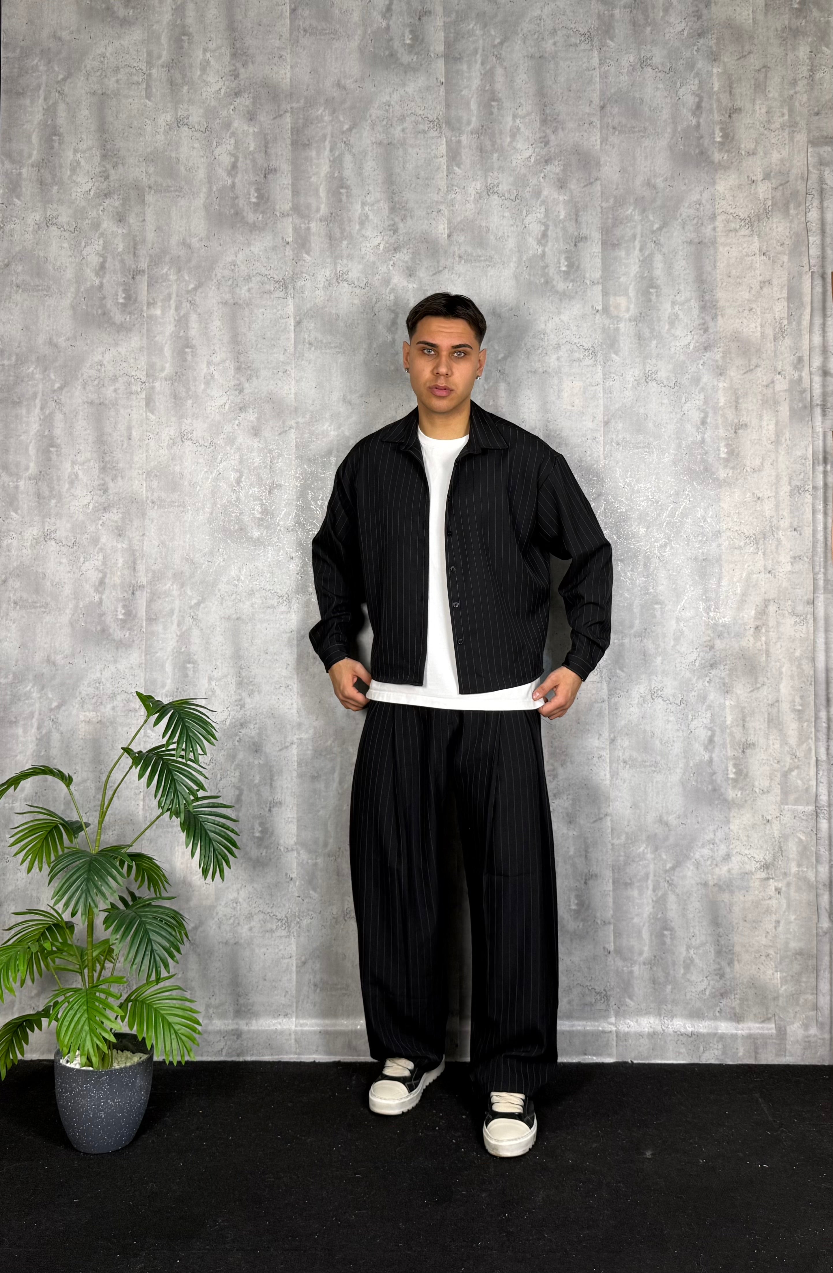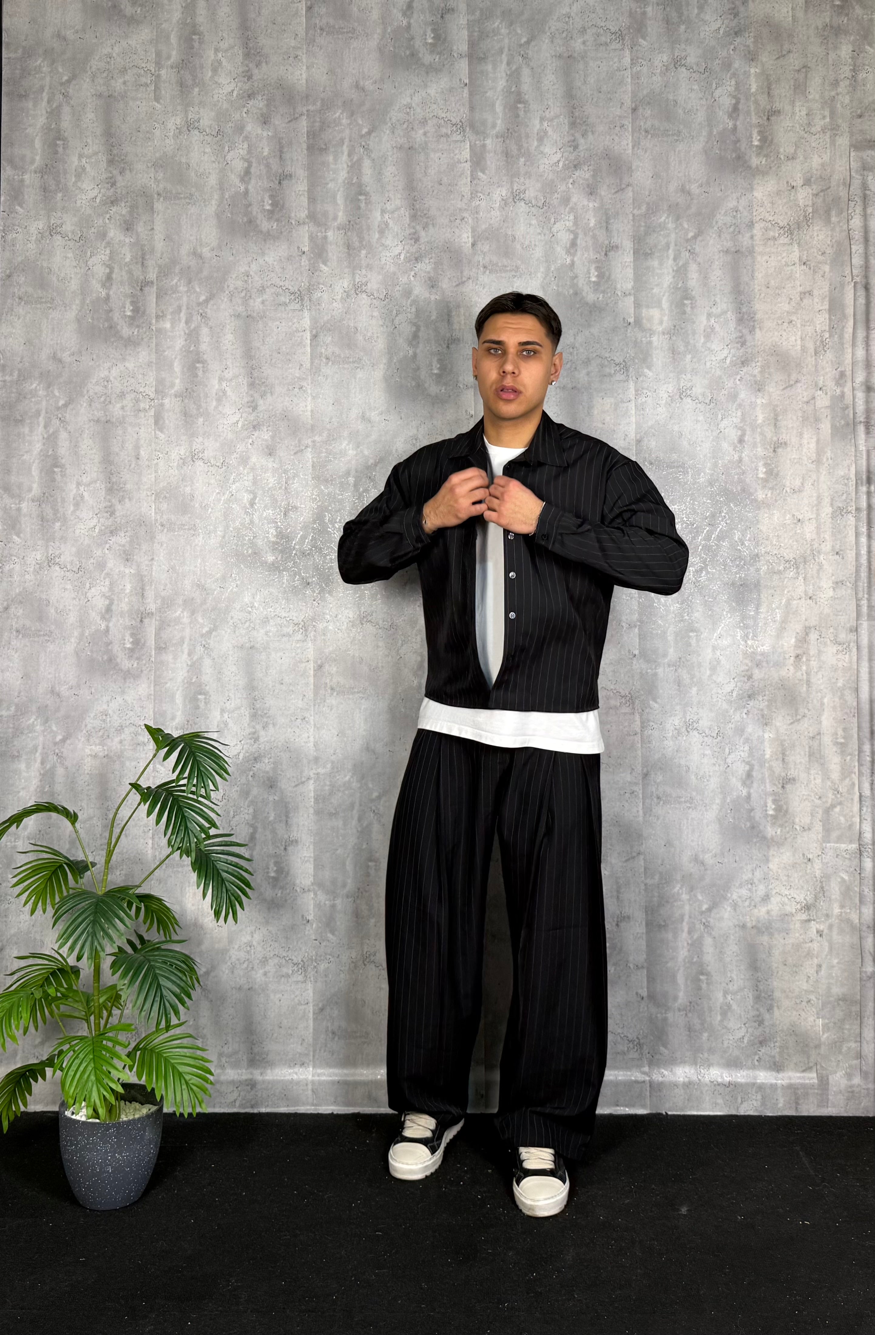 Il modello è alto 180cm x 76kg. Indossa una L. Camicia gessata cropped, si abbina al pantalone super Piences gessato.