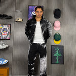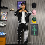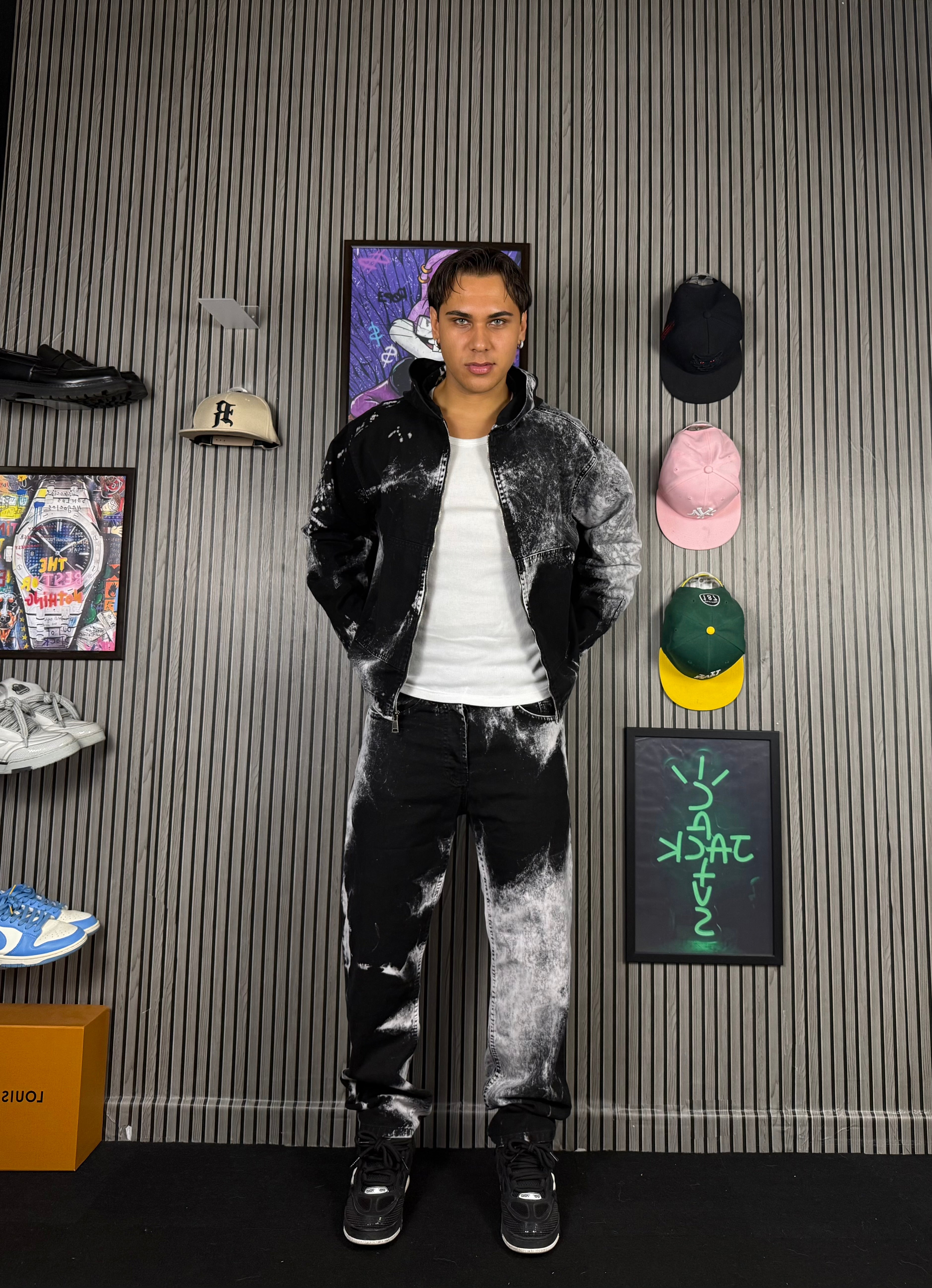 Coordinato di jeans completamente sfumato. Jacket con zip e cappuccio. Jeans con vestibilità baggy. Qualità PREMIUM