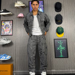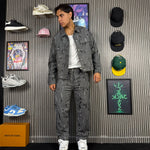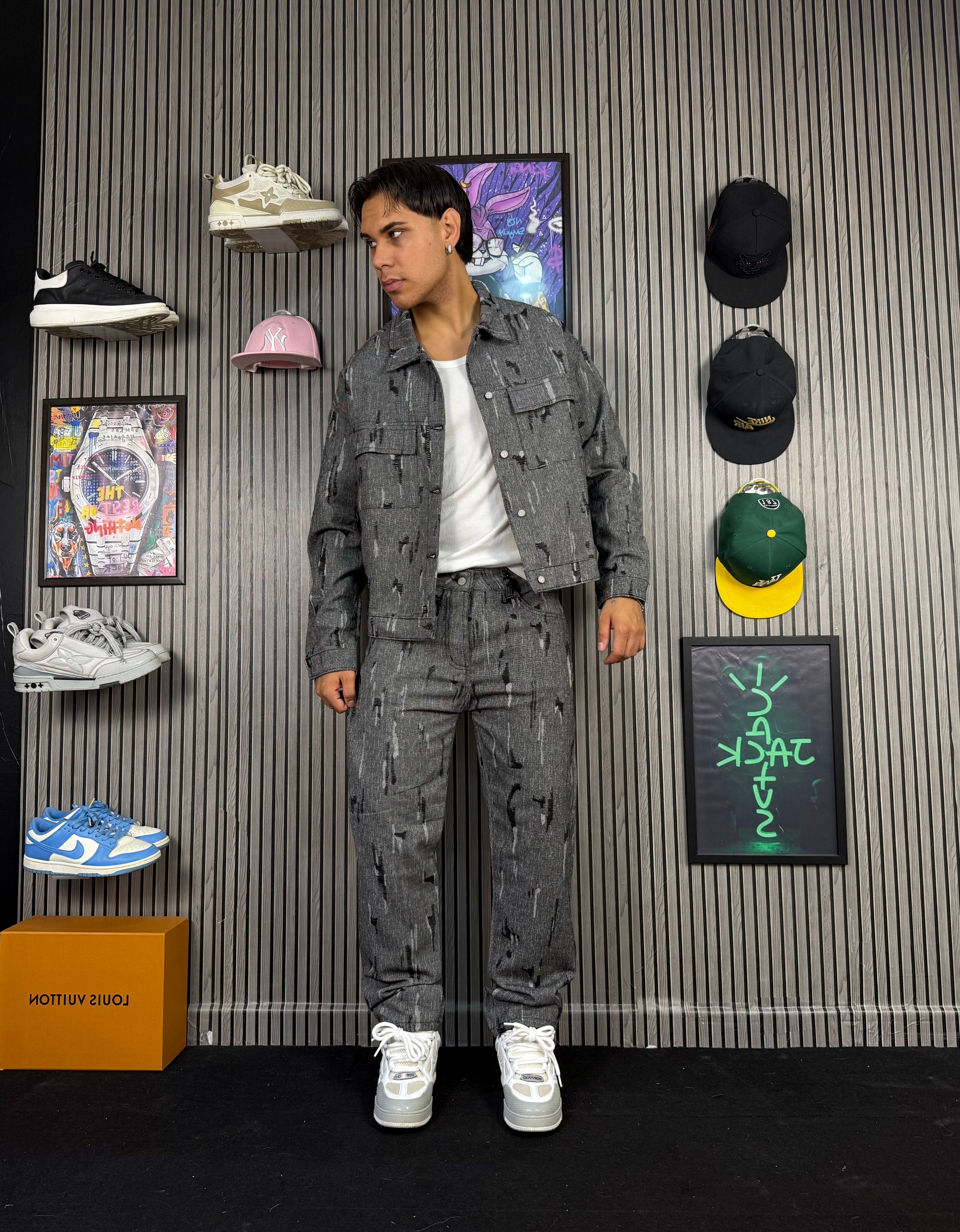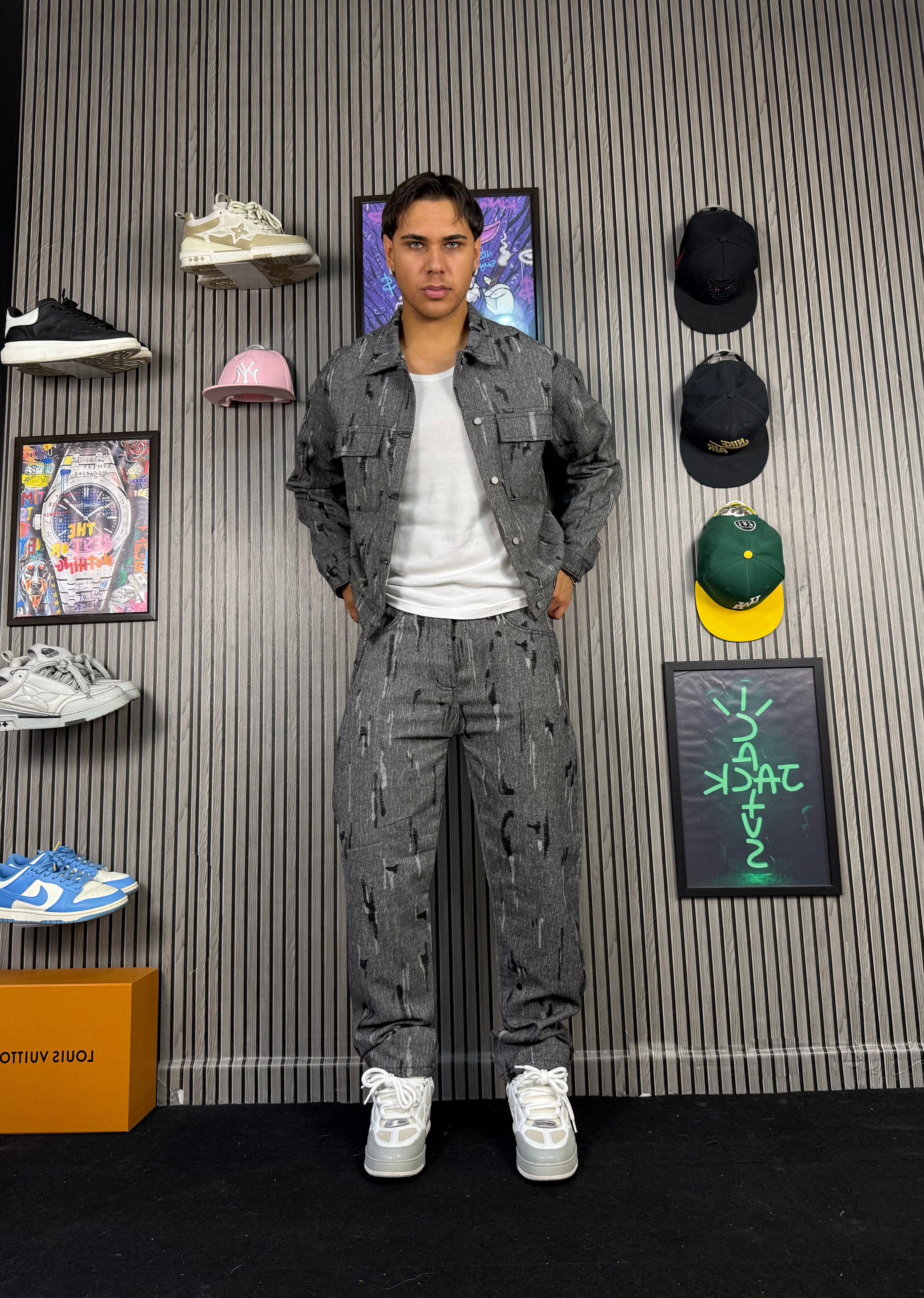 Il modello in foto è alto 180cm e pesa 78kg. Indossa una taglia 48. Coordinato interamente di jeans con rotture su tutto il completo. Jacket con vestibilità crop, pantalone con vestibilità baggy.