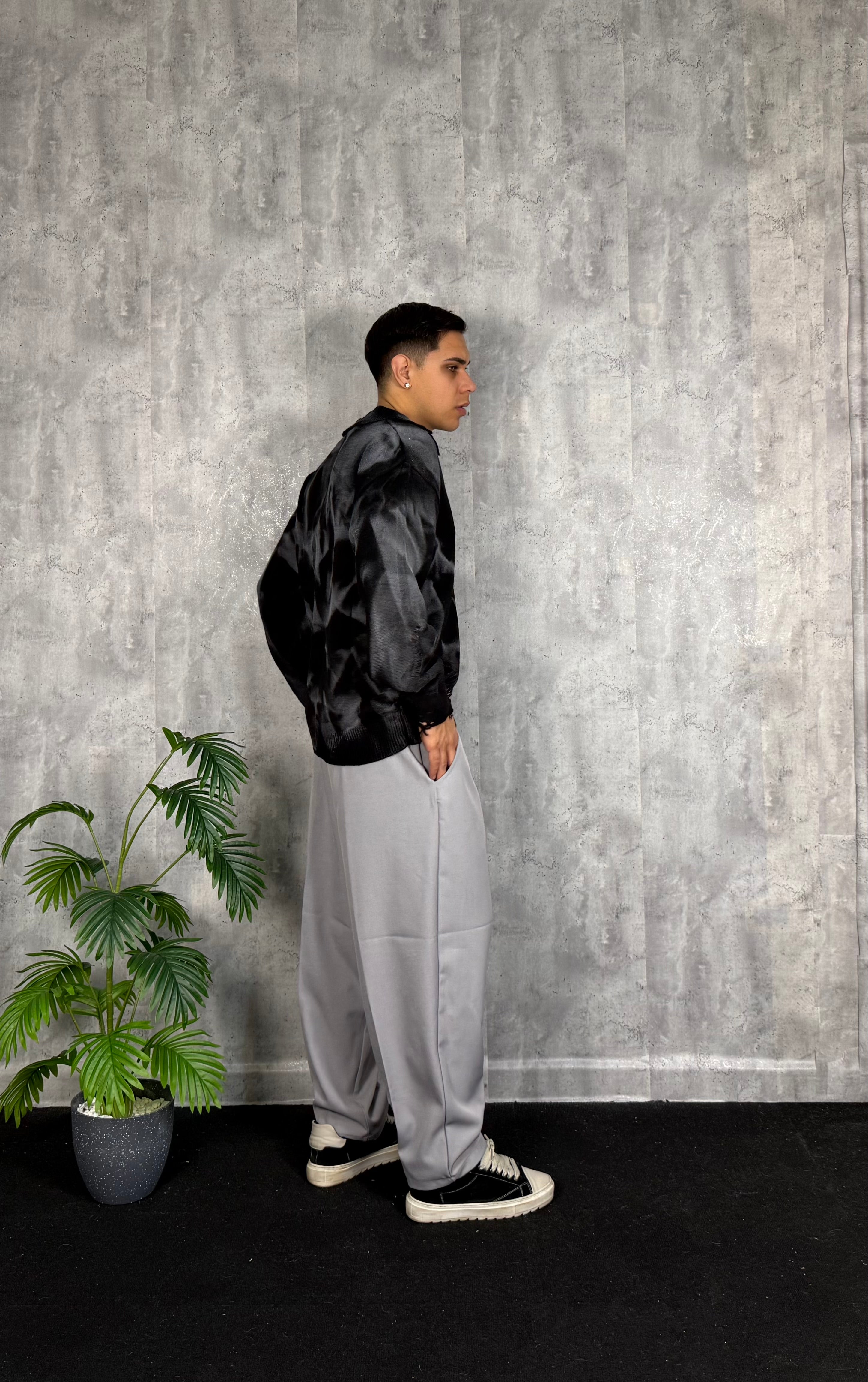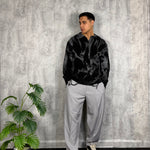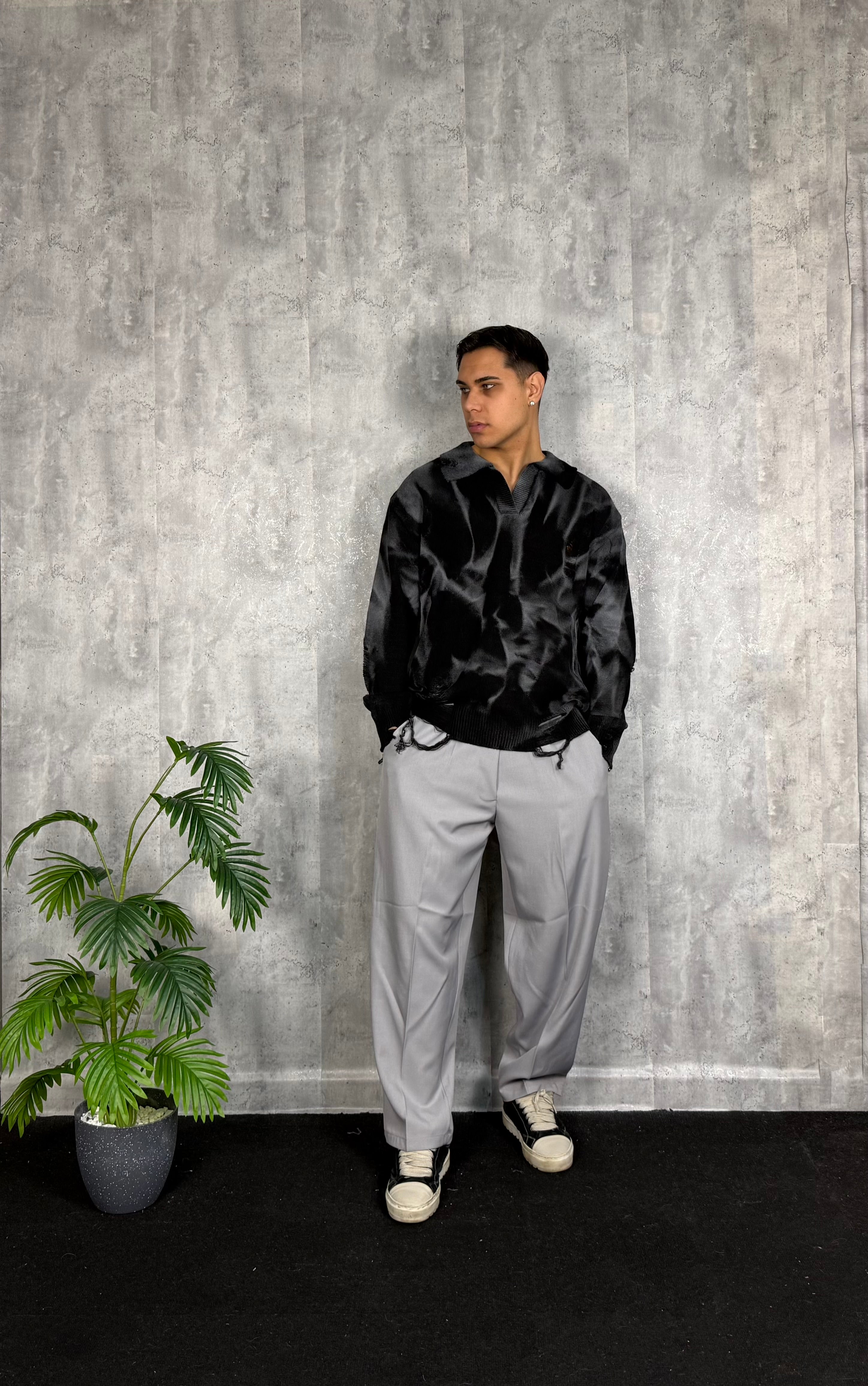 Il modello è alto 180cm x 76kg. Indossa una L. Maglione a polo con dettagli sfrangiati. Sfumature su tutto il tessuto. Spettacolare