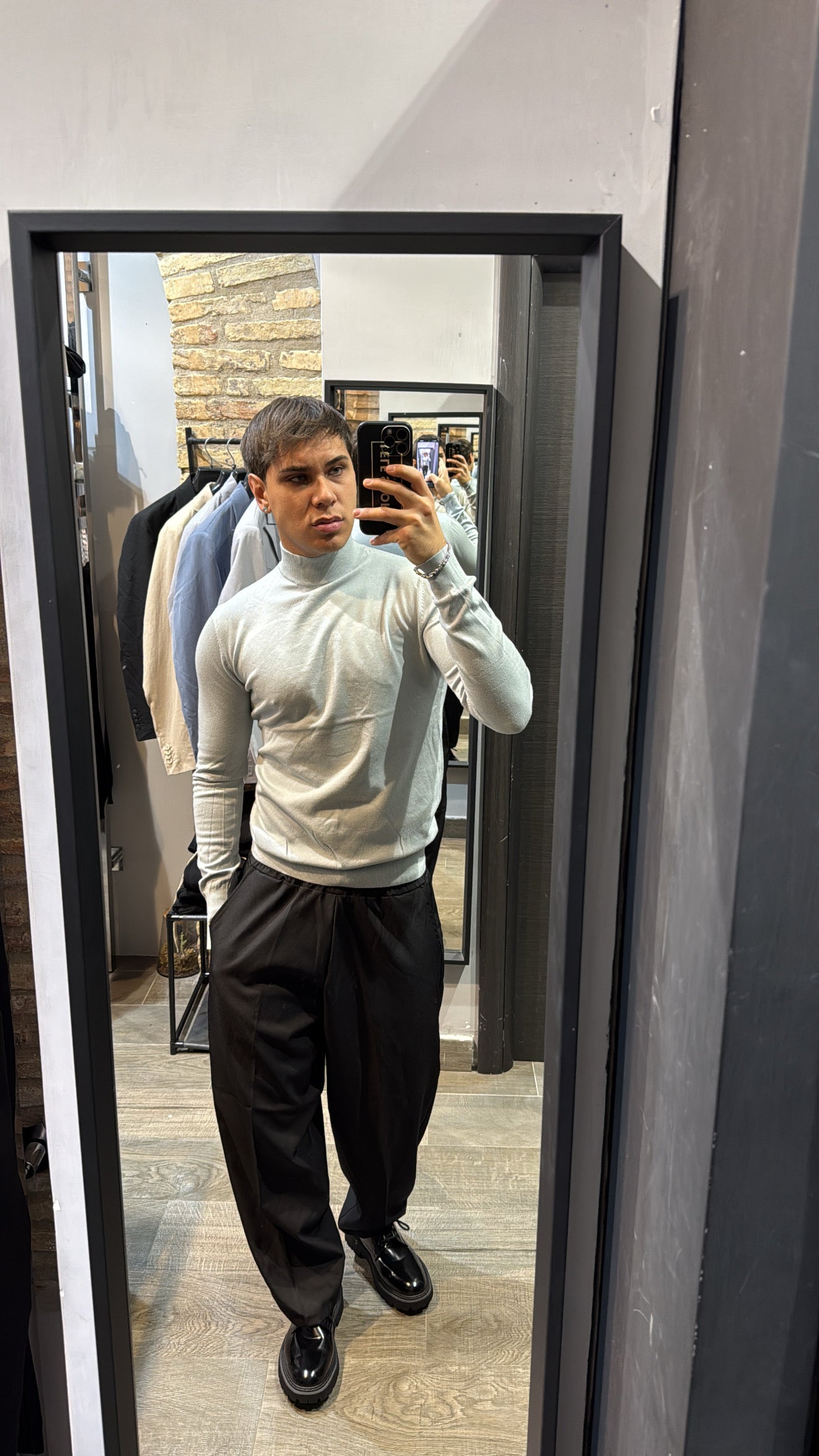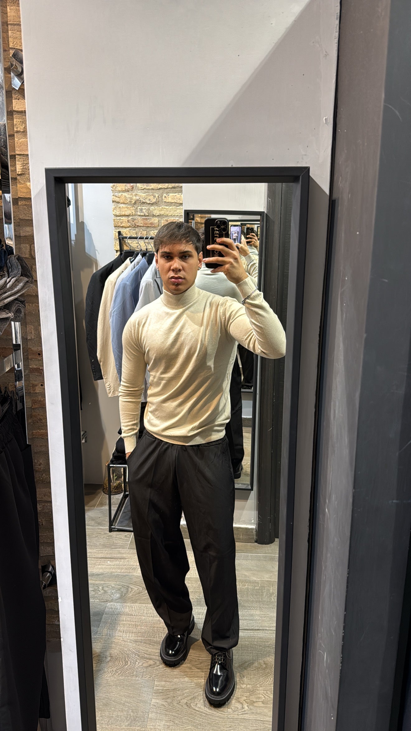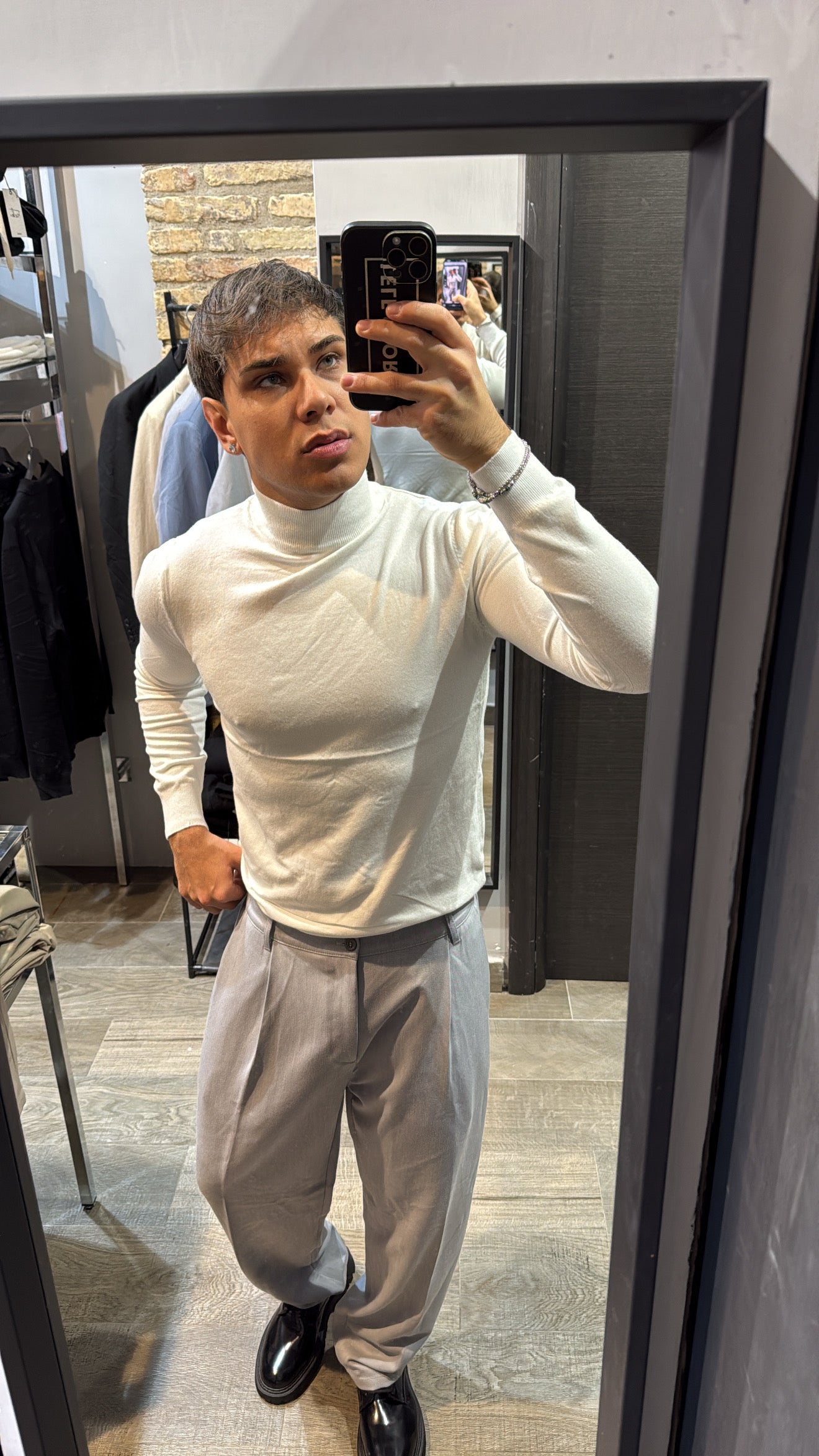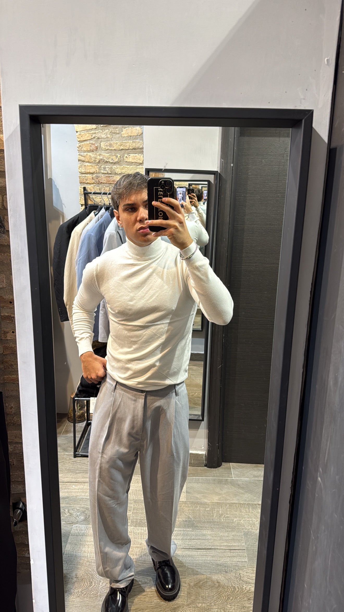 Il modello in foto è alto 180cm x 76kg. Indossa una L. Maglione mezzo collo in filo, vestibilità slim. Effetto cashmere il tessuto. Best seller in tutte le varianti. Si consiglia di prendere una taglia in più
