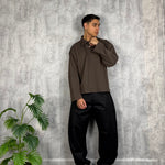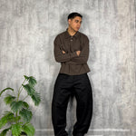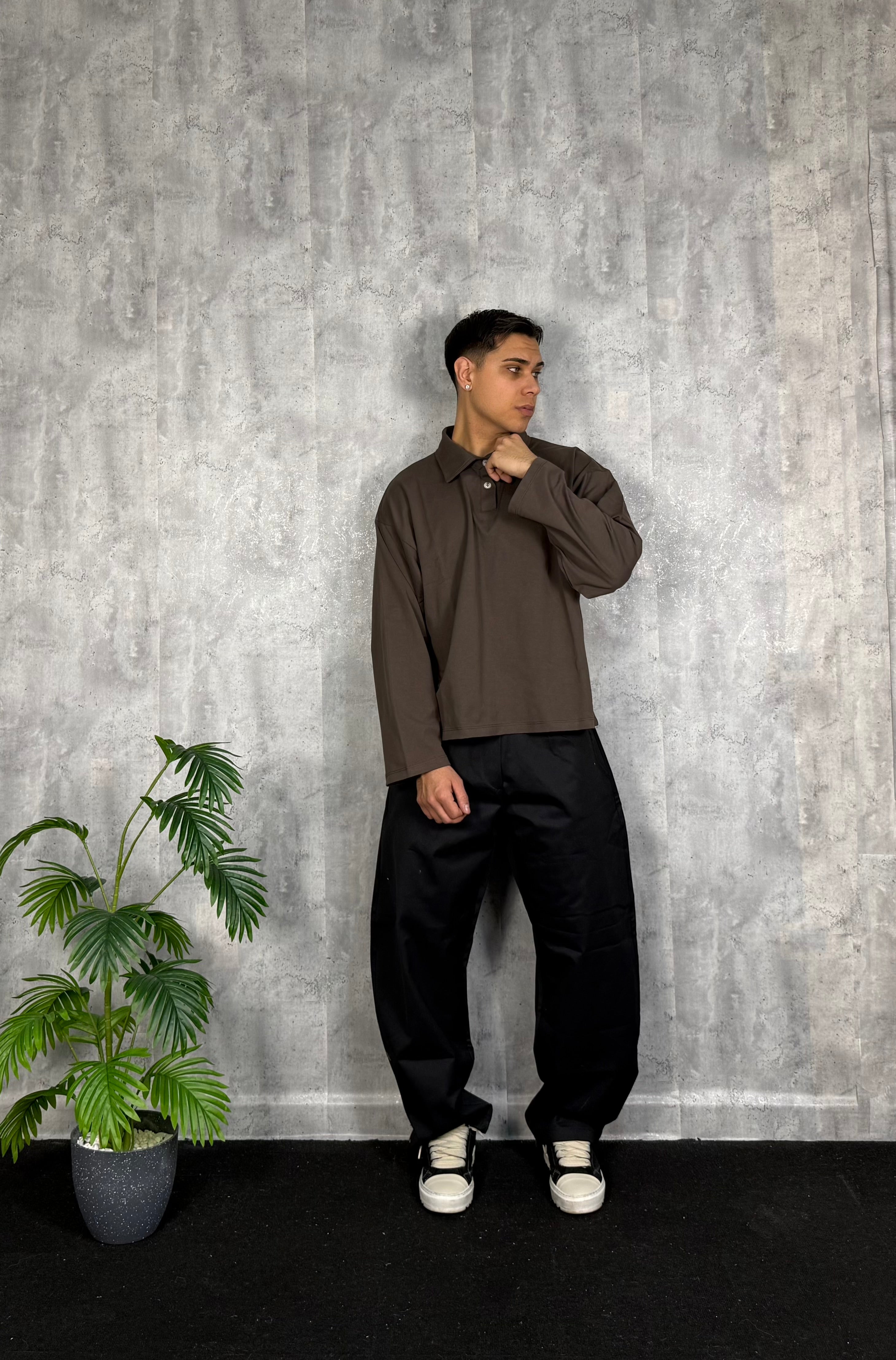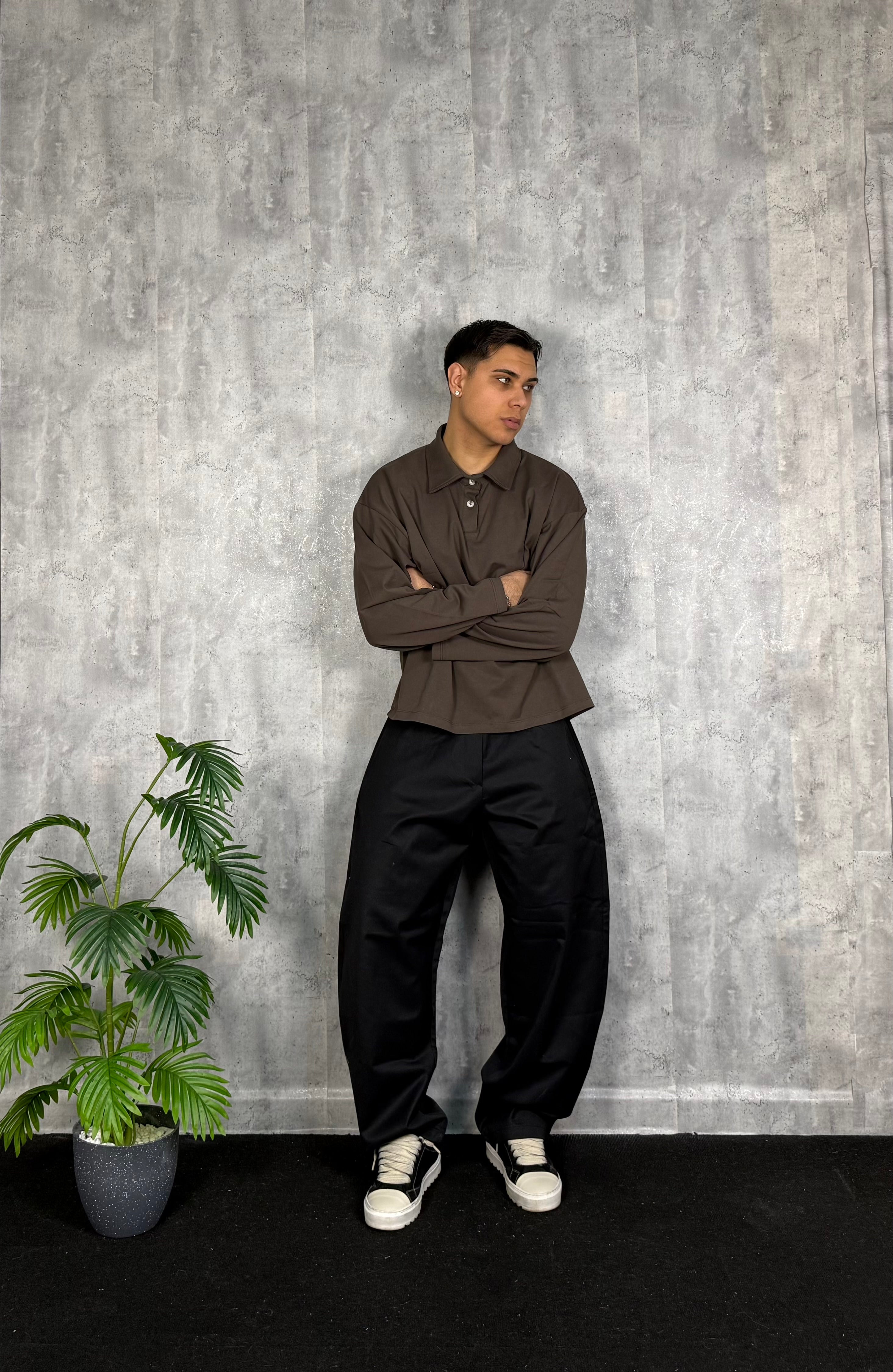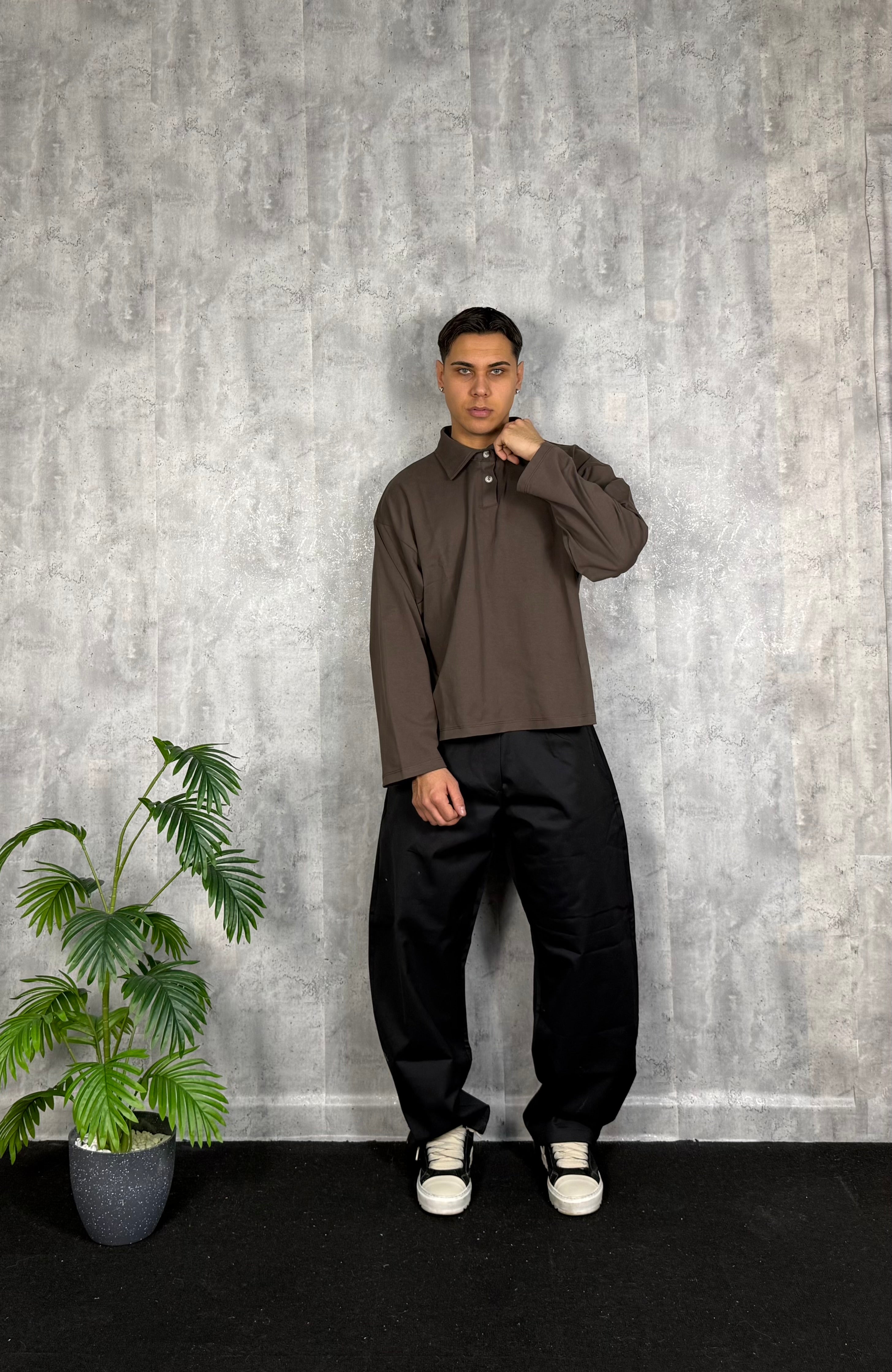 Il modello è alto 180cm x 76kg. Indossa una L. Pantalone in cotone lucido vestibilità ballon. Tessuto rigido. Super virale