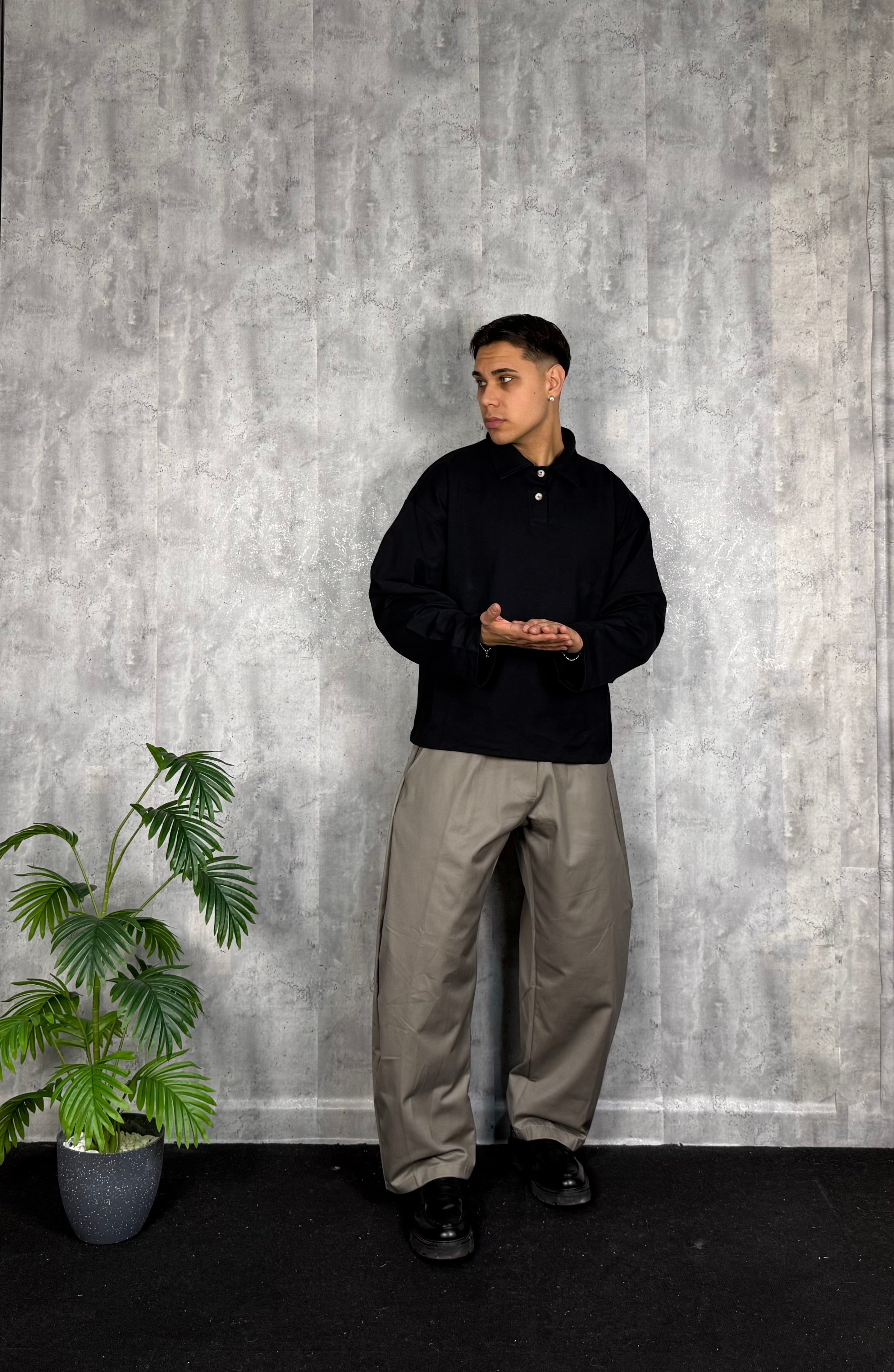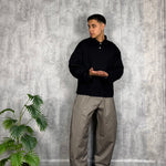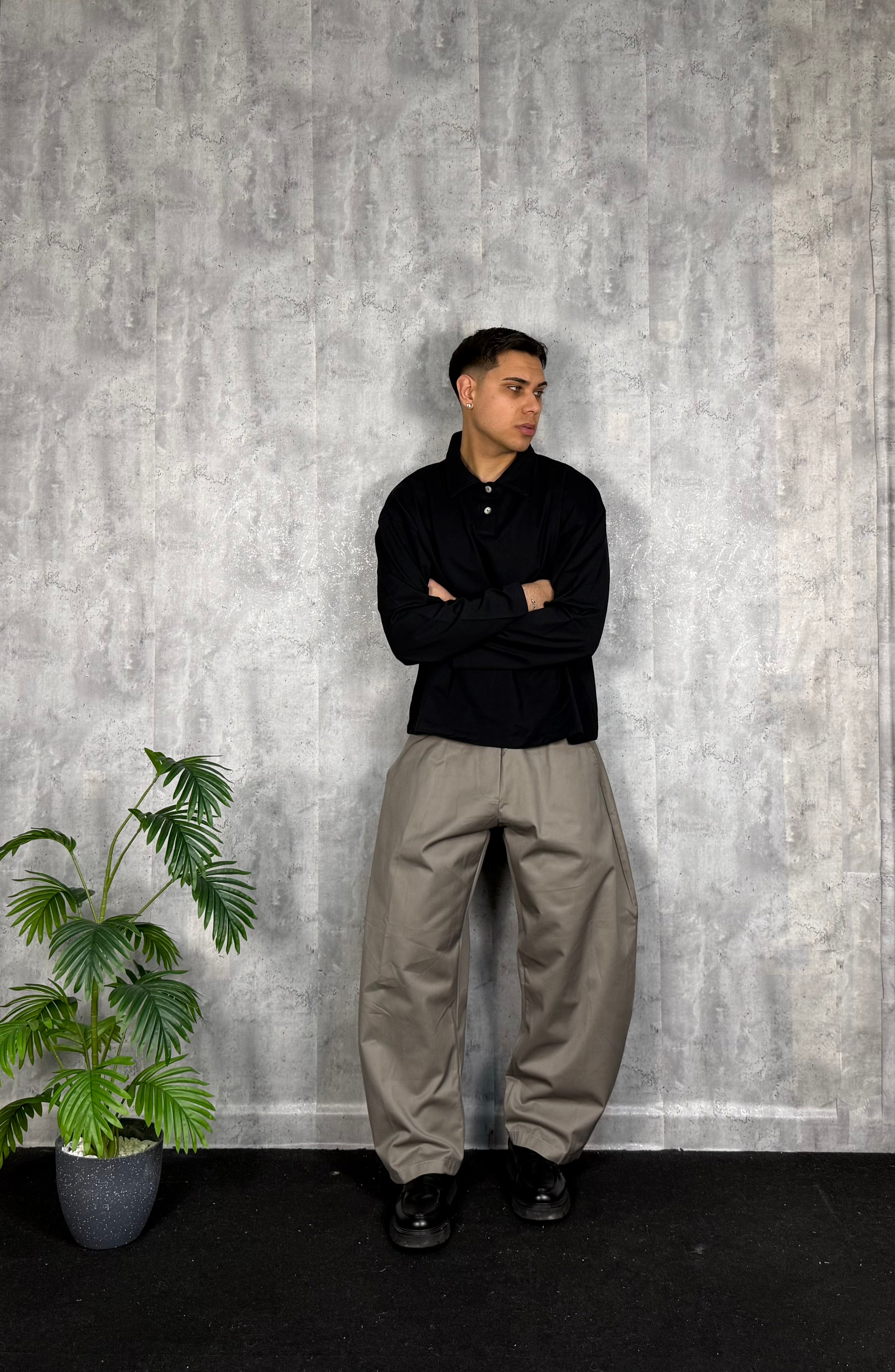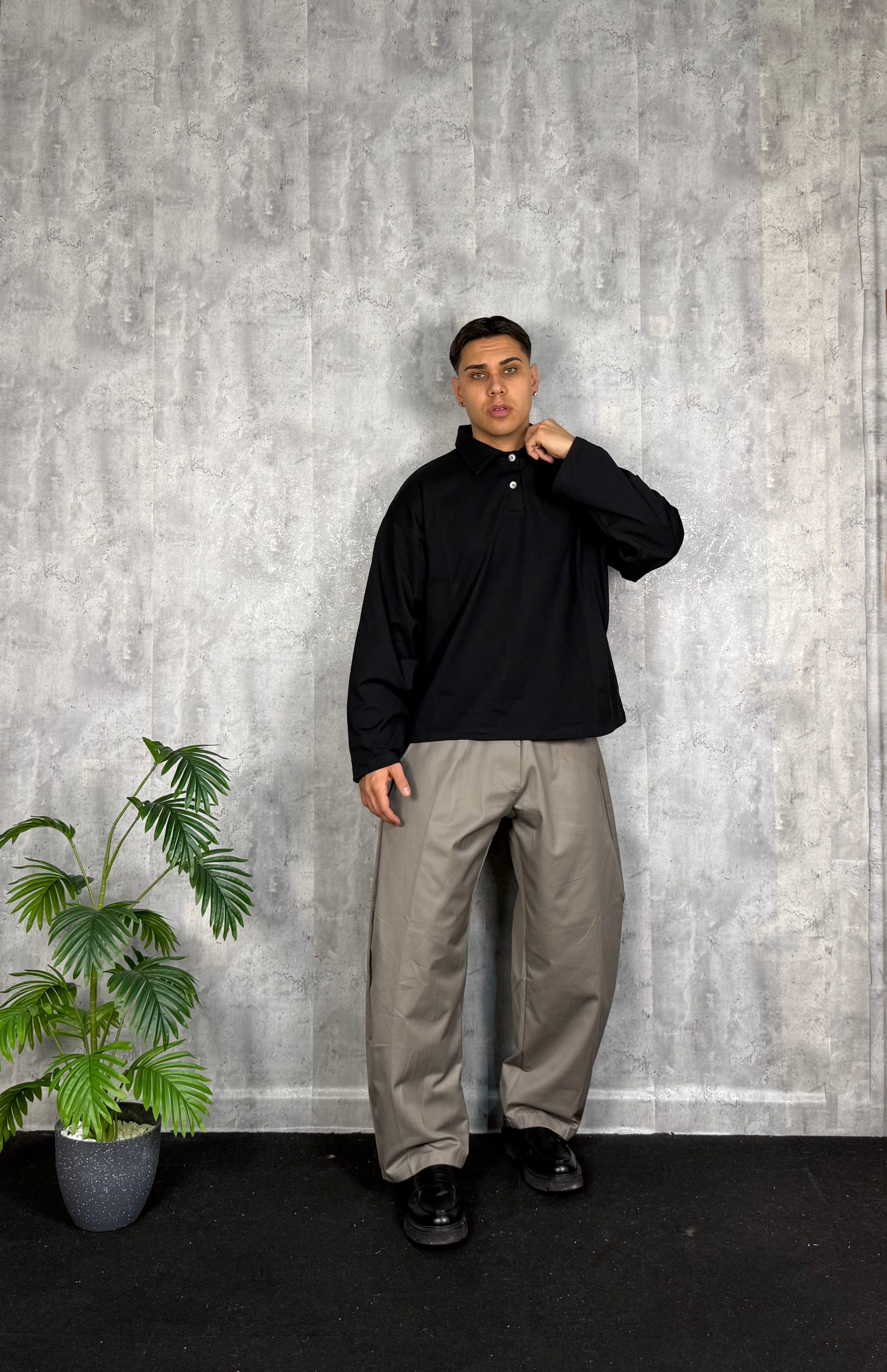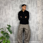 Il modello è alto 180cm x 76kg. Indossa una L. Pantalone in cotone lucido vestibilità ballon. Tessuto rigido. Super virale