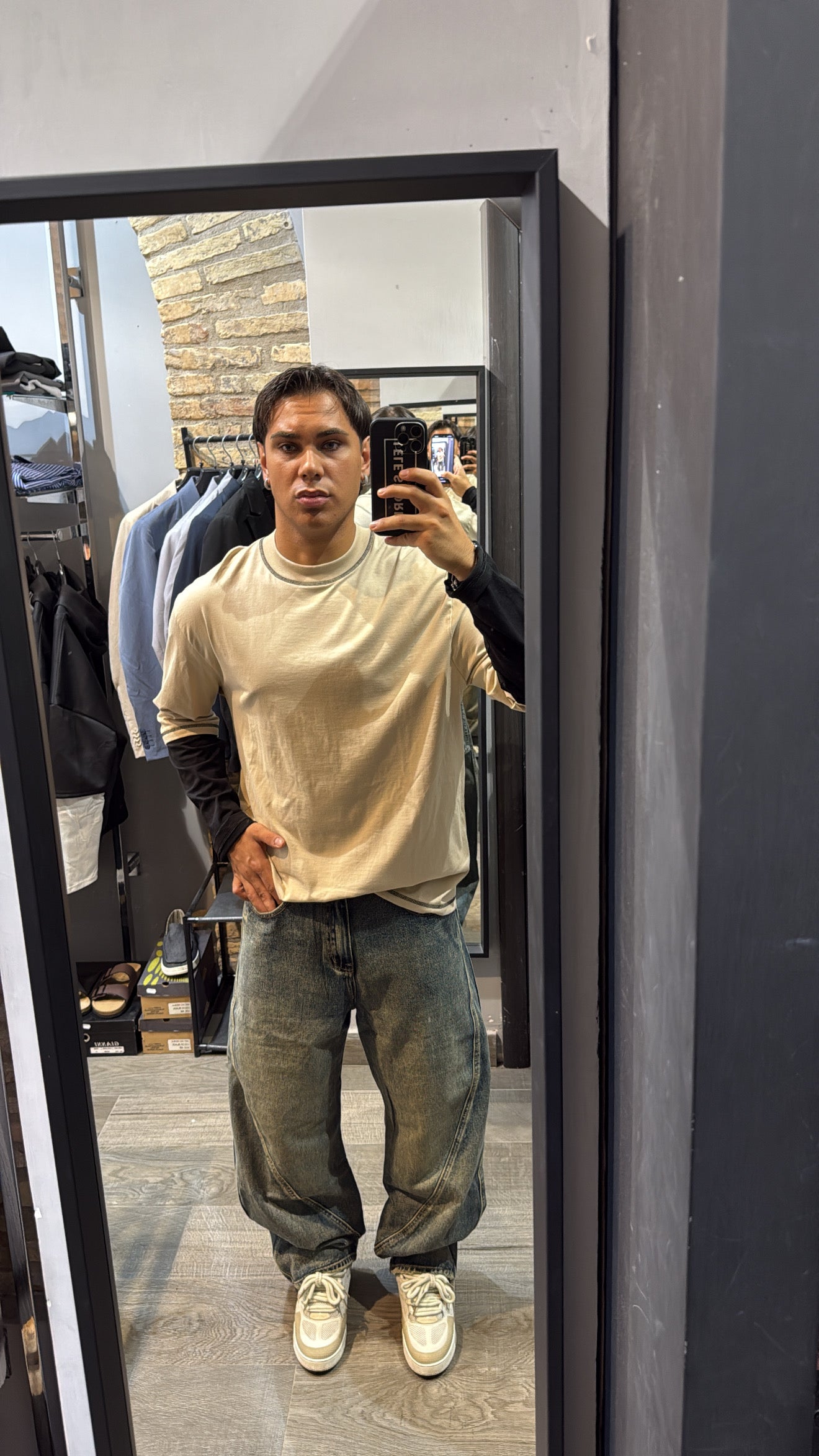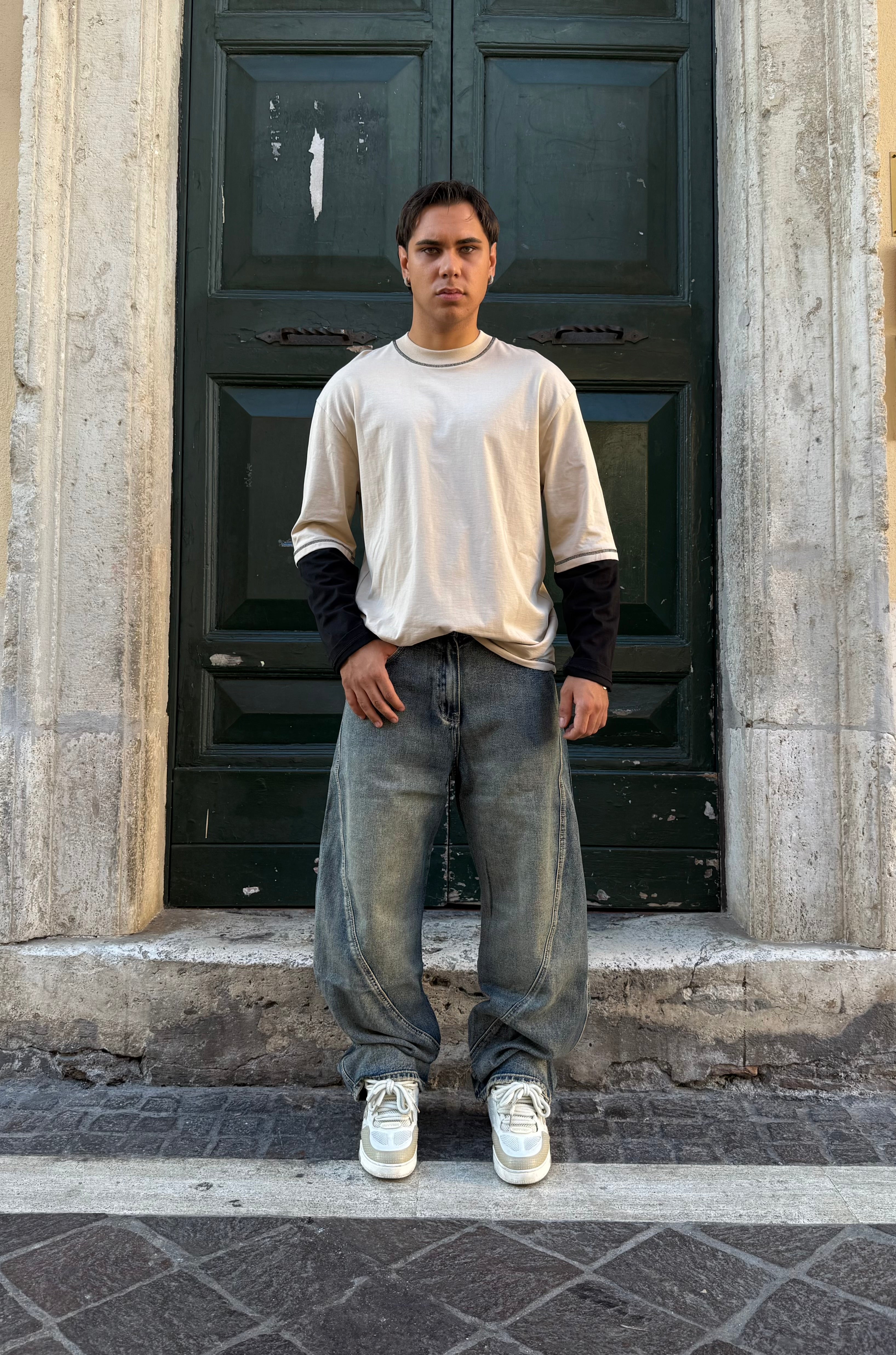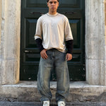Il modello in foto è alto 180cm e pesa 78kg. Indossa una taglia L. T-shirt con cuciture a contrasto e manica doppiata. Vestibilità perfetta.
